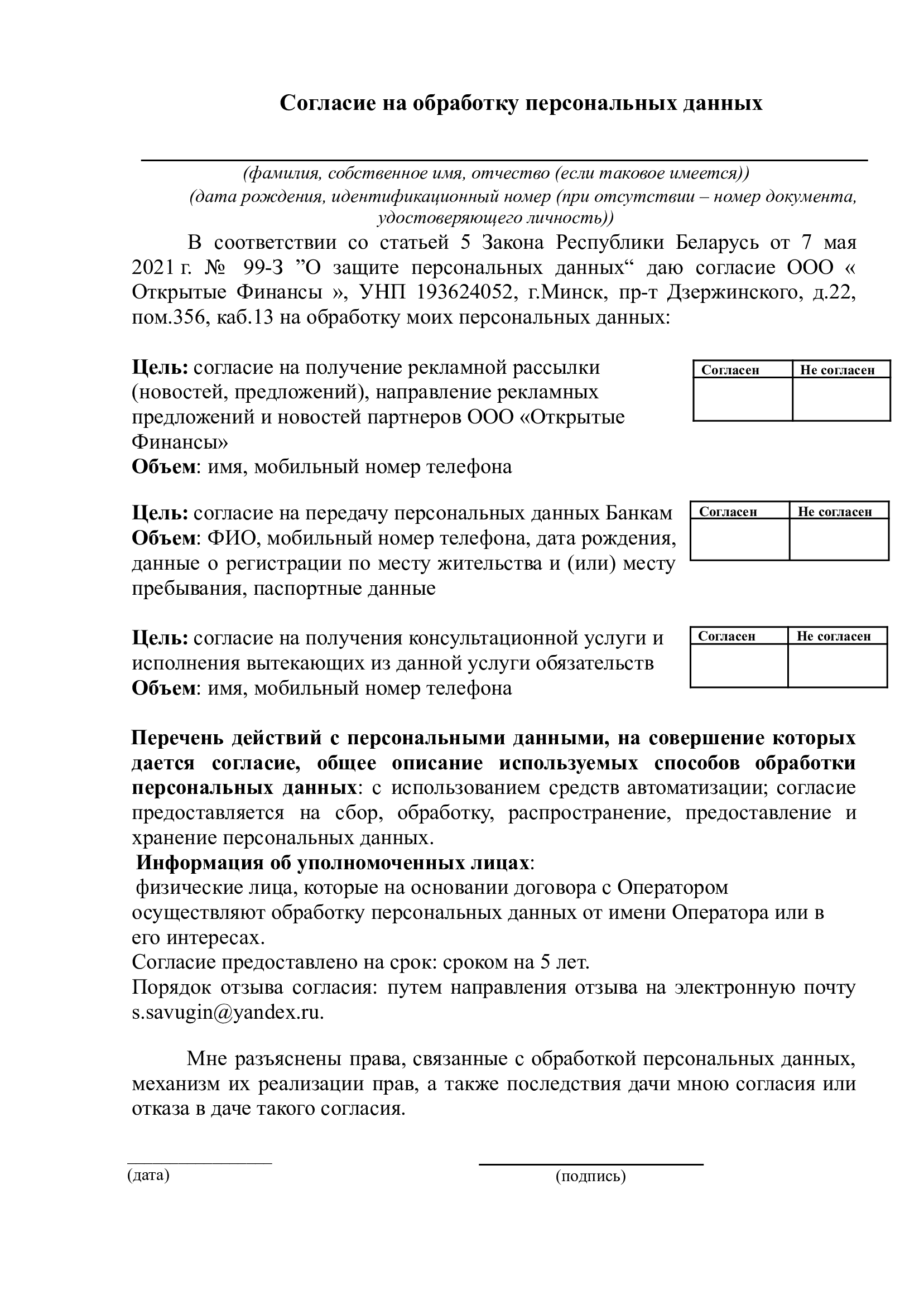 4.1.7. Предоставления Пользователю с его согласия, обновлений продукции, специальных предложений, информации о ценах, новостной рассылки и иных сведений от имени ООО «Открытые финансы» или от имени партнеров ООО «Открытые финансы».